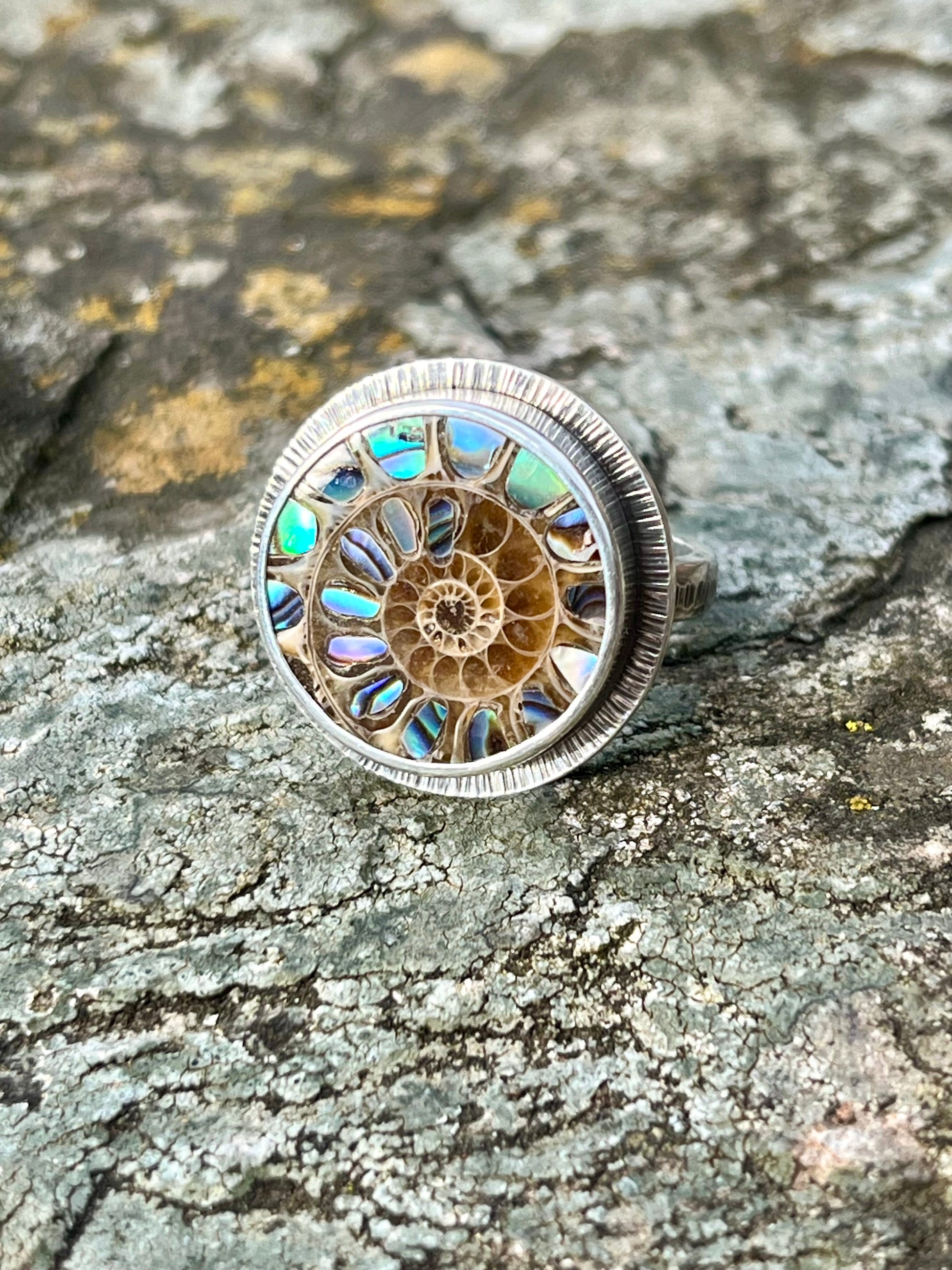 Ammonite with Abalone Inlay Ring - Round ammonite fossil with abalone inlay. The many colors of this inlay look like a stained glass window and match everything in your wardrobe!